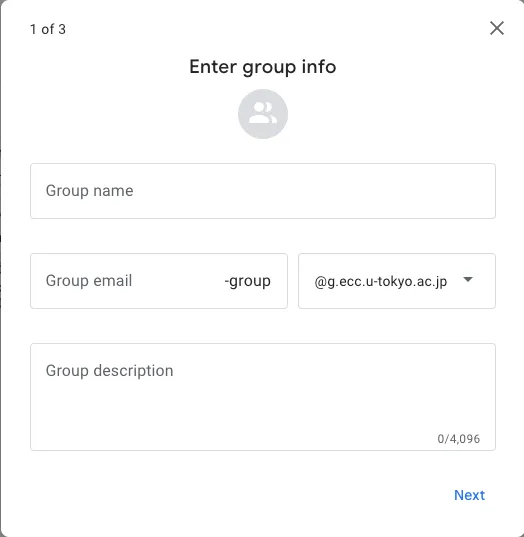 @g.ecc.u-tokyo.ac.jp) or the general domain (@googlegroups.com). If your college/faculty/graduate school or department uses the Information Technology Center’s Email Hosting Service and wishes to use the organization’s domain name, you cannot create the group from this screen. Please consult your domain administrator for details.- If your college/faculty/graduate school or department uses the Information Technology Center’s Email Hosting Service (in Japanese) and wishes to use the organization’s domain name, you cannot create the group from this screen. Please consult your domain administrator for details.
