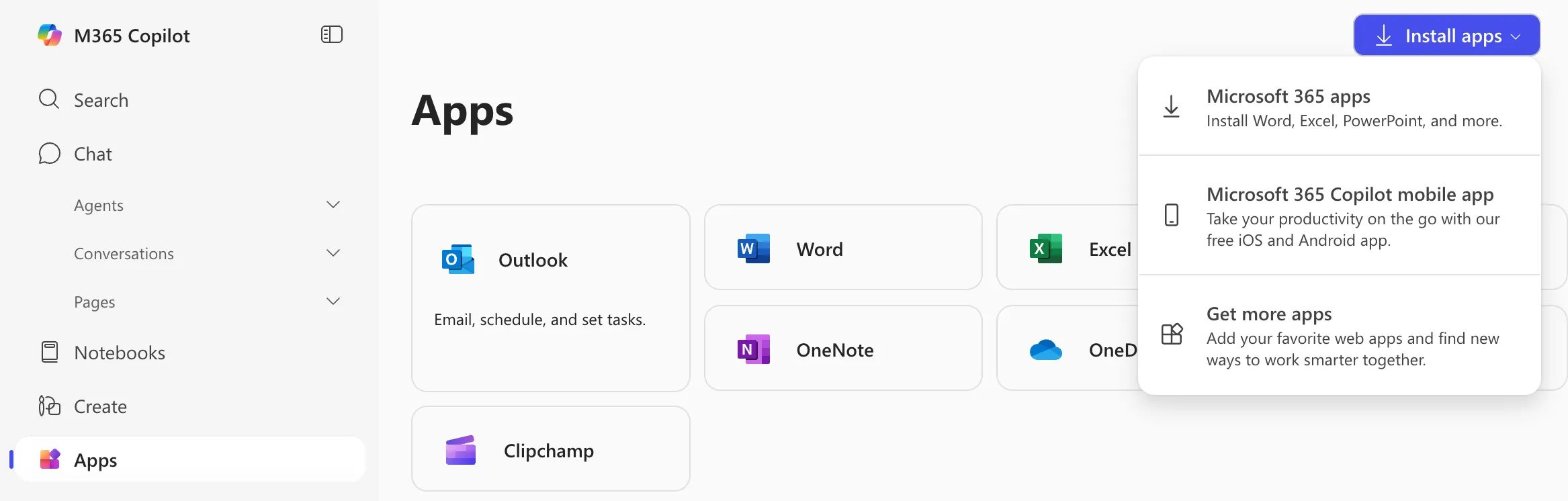 2. Click “Install apps” at the top right of the screen and then click “Microsoft 365 Apps” in the menu that appears.