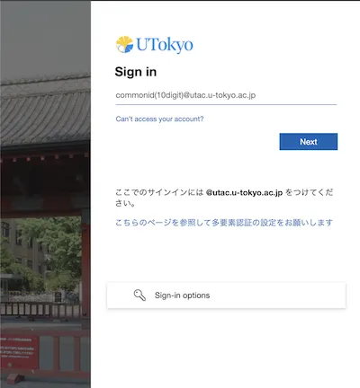 - If “Sign in” (“サインイン” in Japanese) is displayed below the Microsoft or the UTokyo logo