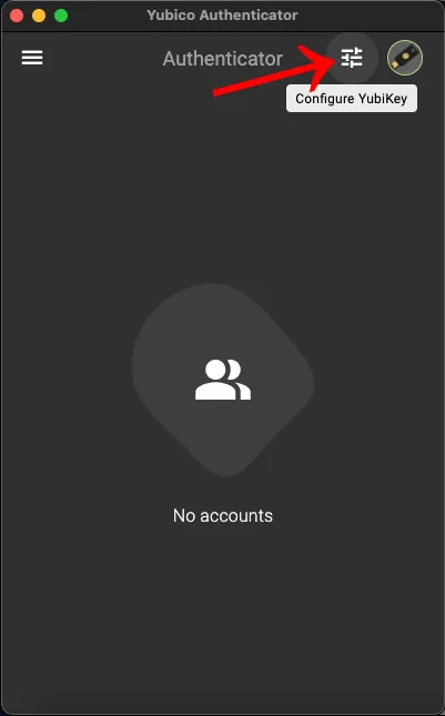 - To add an account to the Yubico Authenticator application, please click on the “Configure Yubikey” in the upper right corner of the screen, and press the “Add account” displayed on the screen.