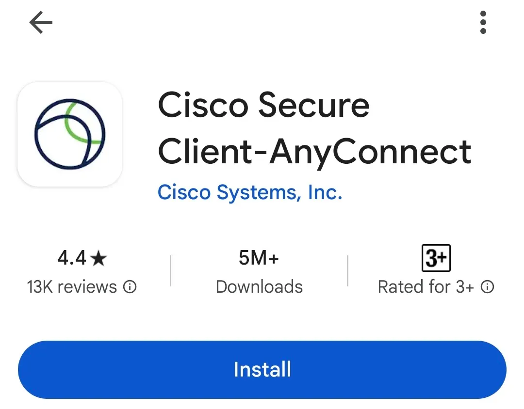 Step A: Access Google Play and install the Secure Client app from Cisco Systems. This app was previously named AnyConnect. Therefore, these two names are shown together in the following image.