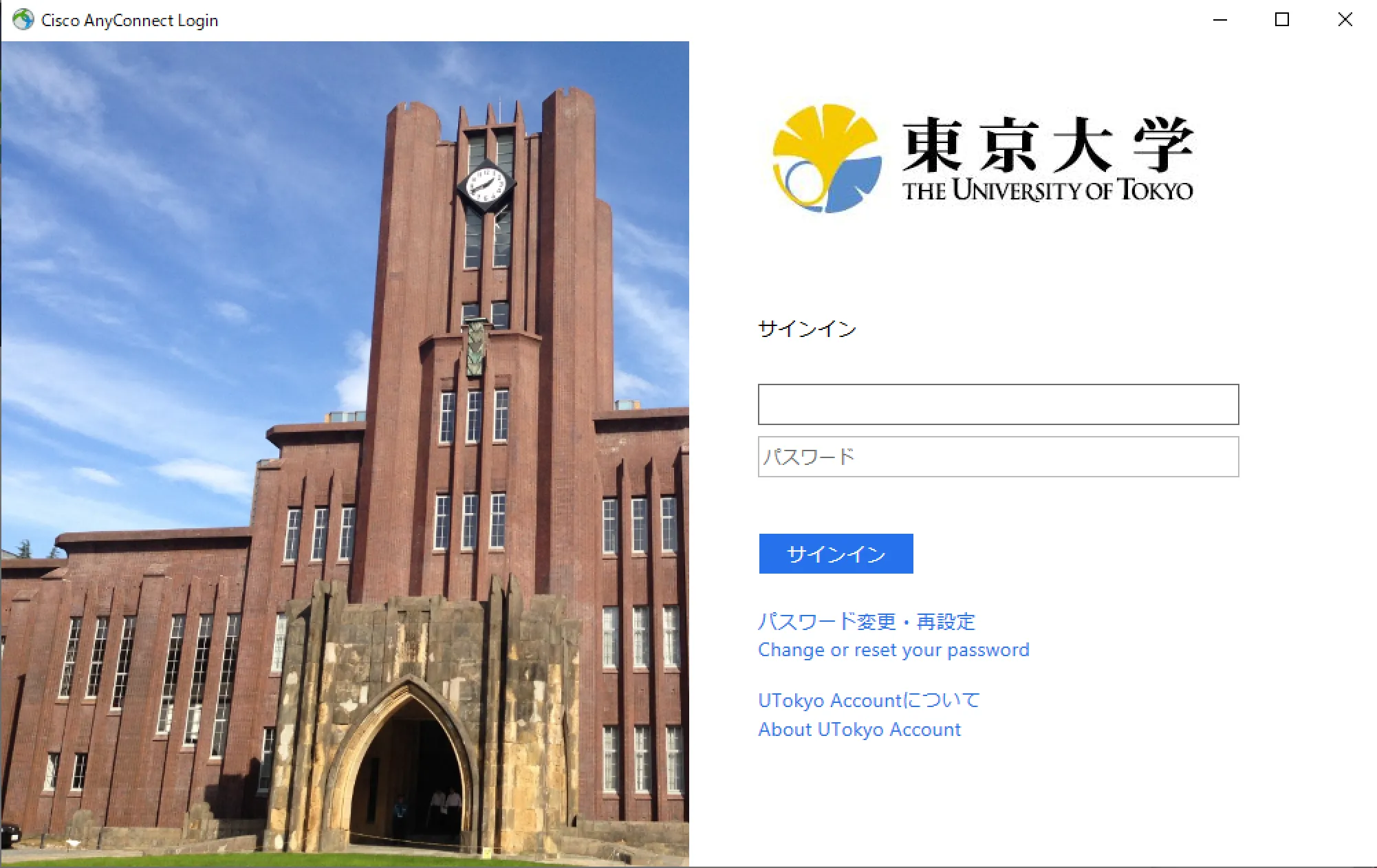 Step F: After clicking the “Connect” button, the following UTokyo Account authentication window appears. Log in with your UTokyo Account.