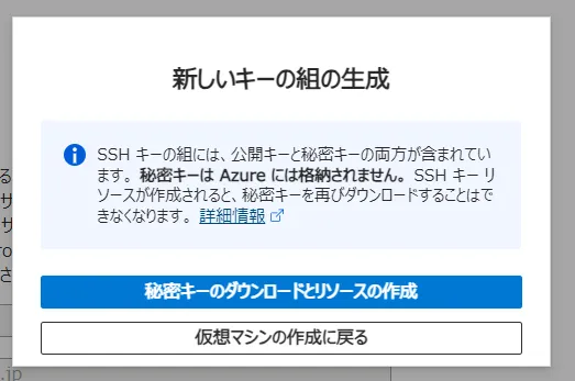 - SSH鍵の新規作成を選択した場合,SSH鍵ペアの秘密鍵をダウンロードするかどうかの選択が表示されるので,ダウンロードしてください.リモートから初期アクセスする際にこの秘密鍵を使ってログインします.作成した仮想マシンにログインするリモート端末の適切な場所に,秘密鍵を事前に配置してください.