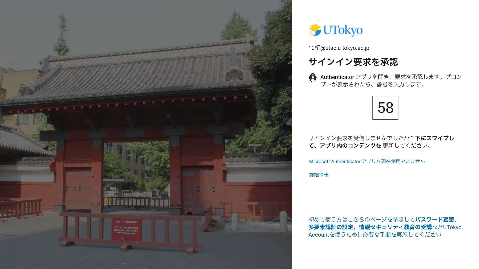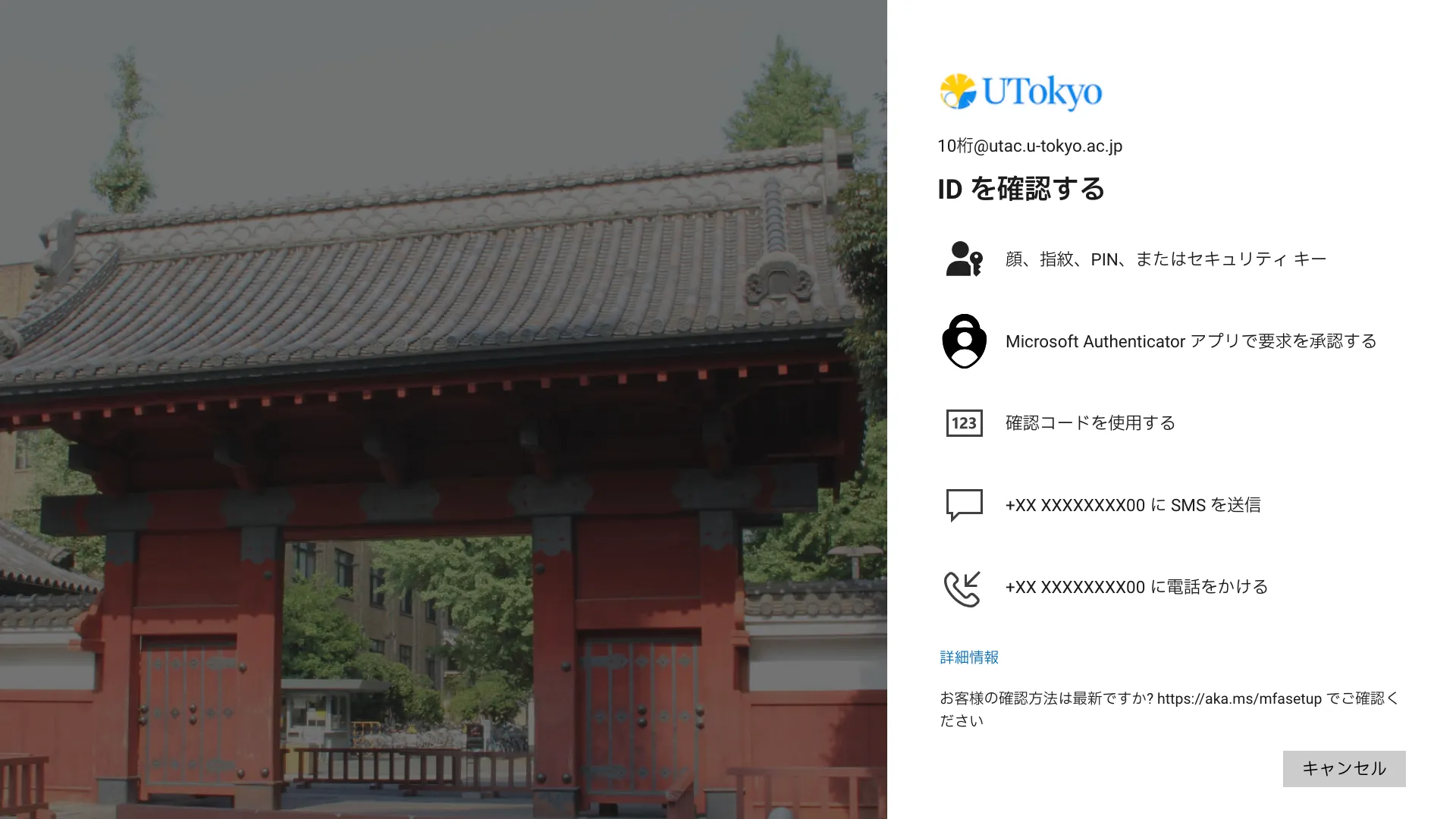 UTokyo Accountでサインイン時(パスワード入力後)に,デフォルトの本人確認方法で多要素認証の本人確認を行う画面が表示されますが,その画面で以下のように操作してください.