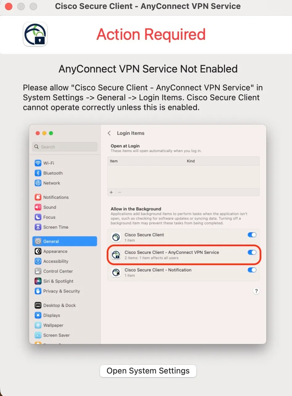 手順C: Cisco Secure Clientのインストールの途中で,以下のような「Action Required AnyConnect VPN Service Not Enabled」というポップアップが表示されることがあります.その際はポップアップの指示に従って,「システム設定」→「一般」→「ログイン項目と機能拡張」にすすみ,「アプリのバックグラウンドでのアクティビティ」(または,「バックグラウンドでの実行を許可」)の「Cisco Secure Client - AnyConnect VPN Service」を有効にしてください.また,以下のような「“Cisco Secure Client - Socket Filter”が新しいネットワーク機能拡張を使おうとしています」というポップアップが表示されたら,「OK」をクリックしてください.