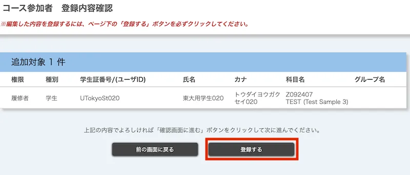 - 追加対象のユーザ(権限)が表示されるので,変更内容を確認の上,「登録する」を押してください.