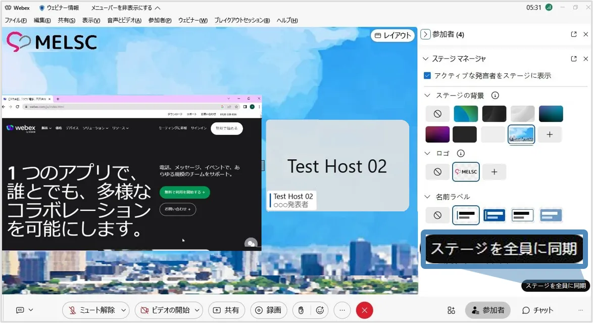 ※停止した場合,出席者はステージマネージャーで設定した背景などは利用することはできません.再度「同期」するとステージマネージャーで設定したレイアウトを使用できます.
