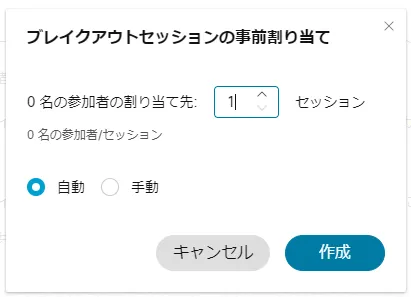 「ブレイクアウトセッション」ボタンを押すと,ブレイクアウトセッションの割り当てウィンドウが表示されます.