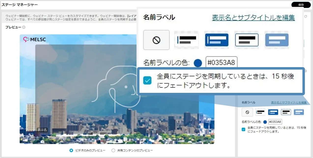 - 「全員にステージを同期しているときは,15秒後にフェードアウトします」を有効にすると,15秒後に名前ラベルは表示されなくなります.無効の場合,名前ラベルは表示しつづけます.