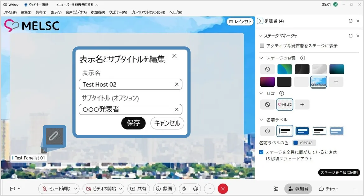 ※ステージに移動したパネリストに対してのみ表示名とサブタイトルを変更することができます.ステージにいないパネリストに対しては表示名のみ変更できます.