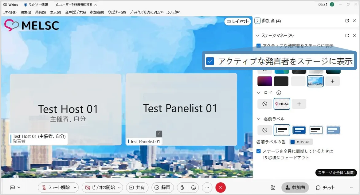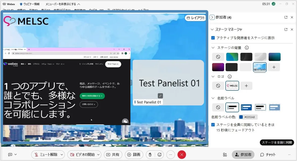 ステージマネージャー機能を使用すると,背景やロゴ・カスタマイズした名前ラベルをステージに設定でき,効果的なウェビナーの開催に貢献します.