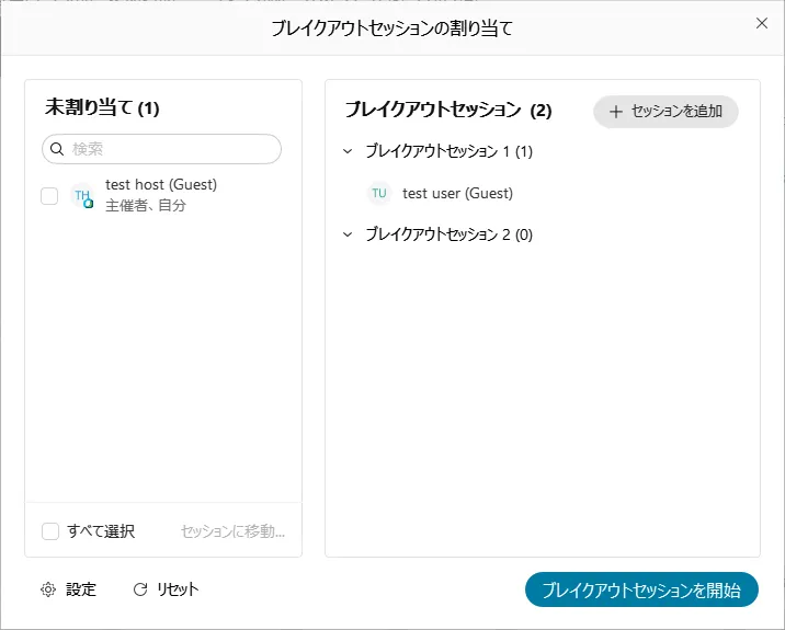 「割り当て」をクリックすると,ブレイクアウトセッションの管理ウィンドウが表示されます.