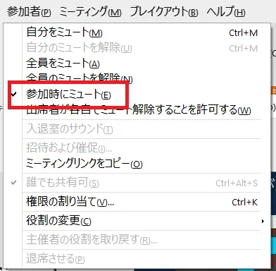会議が開始されてからも,「参加者」メニューに「参加時にミュート」という機能があります.