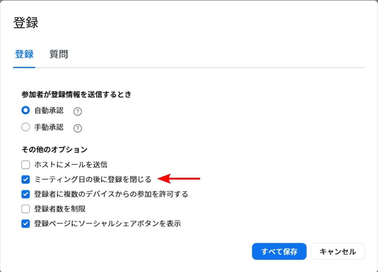 - 「ミーティング日の後に登録を閉じる」チェックボックスをオンにしてください.