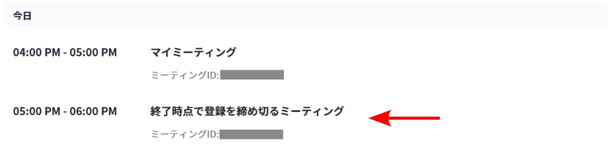 - 自分のスケジュールしたミーティングが,リストとして表示されます.終了予定時刻が過ぎた時点で登録手続きを受け付けないようにしたいミーティングの名前を押してください.