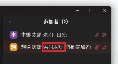 表示された参加者の一覧のうち,共同ホストになっている参加者には,名前の右側に「(共同ホスト)」の表示があります.