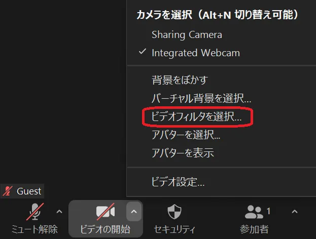 2. メニューの中から「ビデオフィルタを選択」を選んでください.