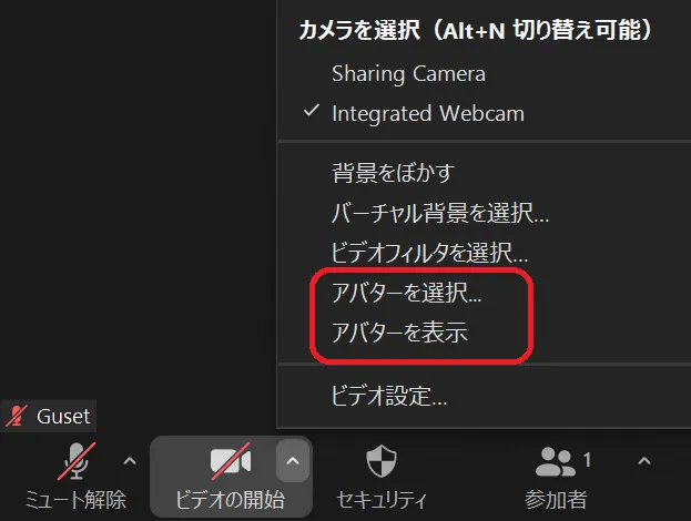 2. メニューの中から「アバターを選択」を選んでください.(「アバターを表示」を選択すると事前に設定されたアバターが表示されます.)