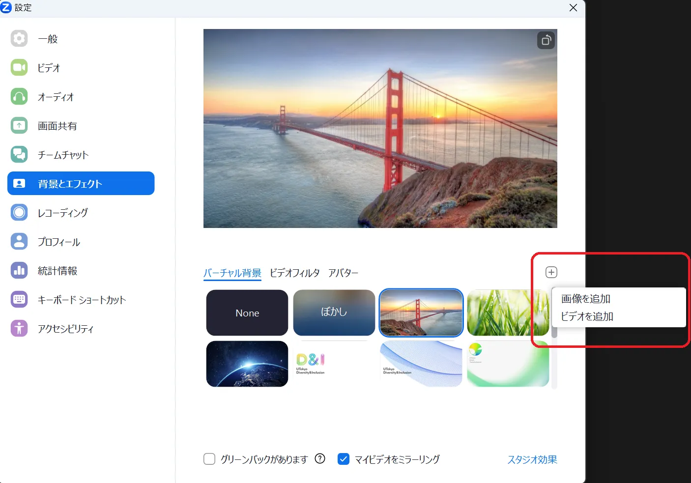 • 設定によっては,映像の左右が反転し,背景画像が鏡文字になってしまうことがあります.必要であれば,設定の「背景とエフェクト」内にある「マイビデオをミラーリング」のチェックボックスのオンオフを切り替えてみてください.