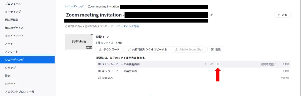 また,ある1回のミーティングの録画の中で一部のファイルのみを削除することもできます.例えば,スピーカービューと共有画面を別々に録画している場合に,スピーカービューの録画のみを削除するような操作が可能です.