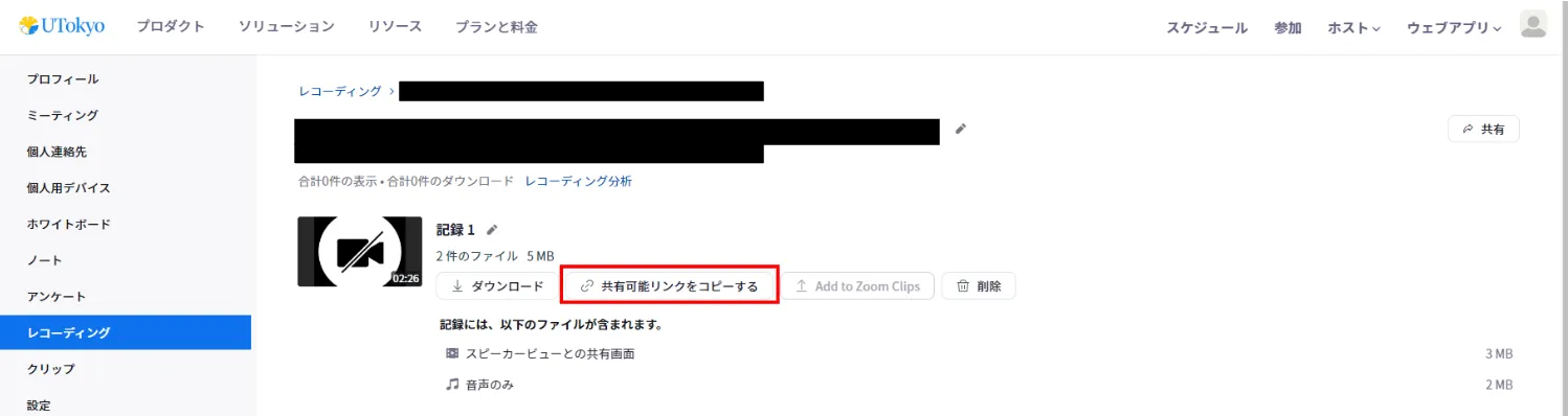 クラウドレコーディングについては,共有用のURLを知らせることで,レコーディングを共有することができます.Zoomのウェブポータルの「レコーディング」から,「クラウド レコーディング」を開き,共有したいレコーディングを押すと,各レコーディングの詳細の画面が表示されます.そこに「共有可能リンクをコピーする」というボタンがあります.これを押して共有用のURLをコピーし,必要な人に知らせてください.